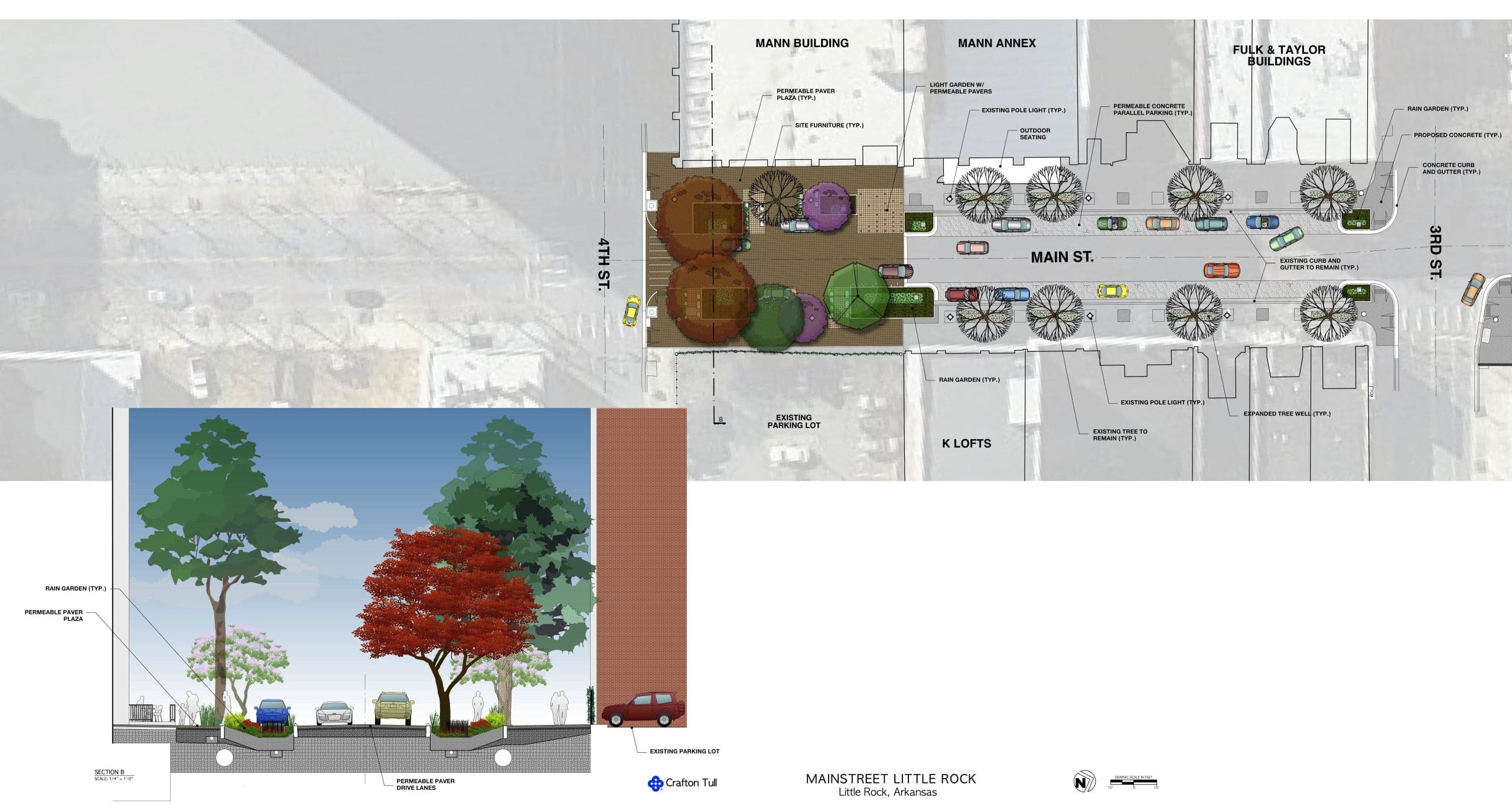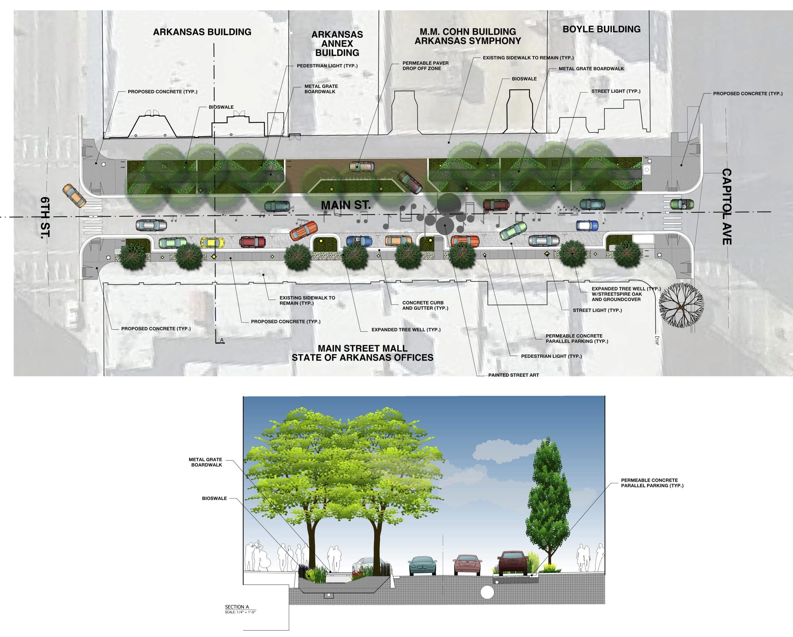 LITTLE ROCK – As part of the award-winning Creative Corridor design, construction began recently on improved landscaping and water systems along several blocks of North Main Street in Little Rock. In order to improve the existing tree canopies, some trees along the street will be replaced and other more appropriate trees will be added along with improved landscaping.