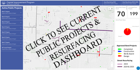 Approximately $170 million dollars has been allocated to Public Works since 2012 for capital improvements of streets, drainage, traffic signals, street resurfacing, sidewalks, and trails. For more details on current and recent capital improvement projects for streets and drainage, refer to the links shown below.