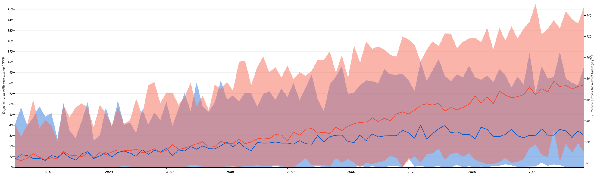 The graph below shows the increase in projected number of days per year that will be above 100°F in Pulaski County. Source: The Climate Explorer