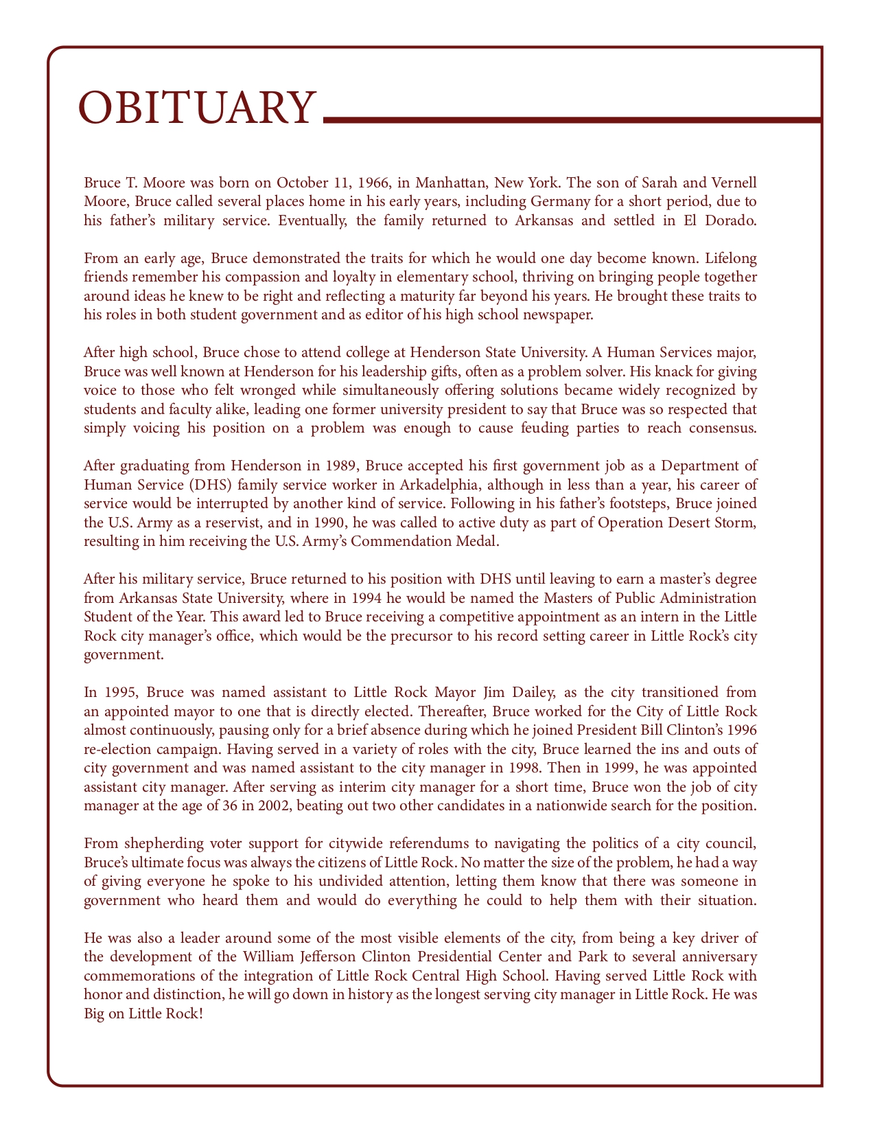 We honor the incredible life and legacy of our beloved City Manager, Bruce T. Moore. His legacy will forever echo through the streets of Little Rock, and we owe him an immeasurable debt of gratitude for helping shape our city into what it is today. Thank you, Bruce, for your guidance, dedication, passion, and unwavering service to Little Rock.
