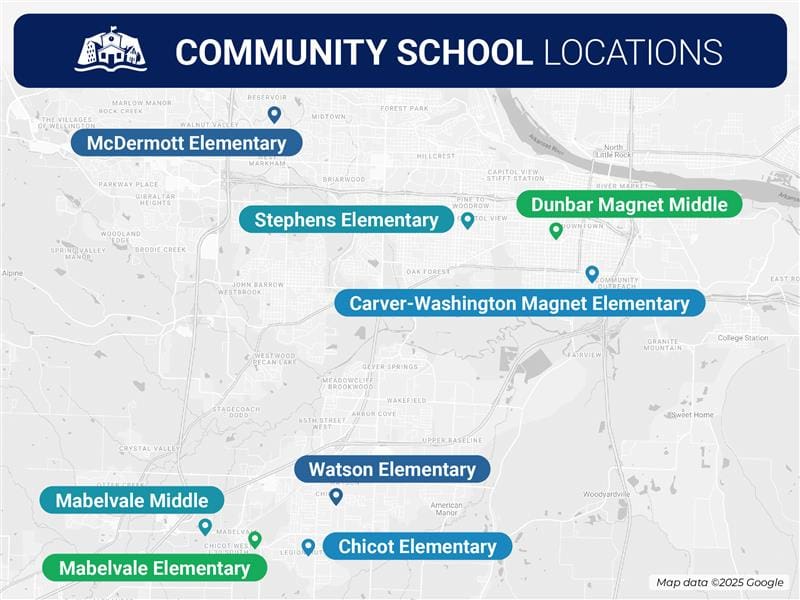 The current schools were chosen from key locations in some of Little Rock’s most vulnerable neighborhoods, identified to have needs including food insecurity, lack of access to healthcare, large numbers of families whose first language is not English, and high rates of absenteeism among students. Across these schools, large numbers of students were not reading at grade level. In coming years, we anticipate expanding the Community Schools program to include additional elementary and middle schools.