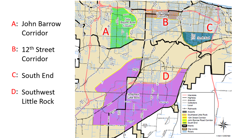 In December 2020 the Little Rock City Board passed resolution no. 15,382 to support the Targeted Community Development Initiative that seeks to address systemic inequality, enhance development, and improve the living conditions and overall appearance in areas of Wards 1, 2, 6, and 7 (as a result of revised ward boundaries part of Ward 3, in the 12th Street corridor, is now also included). Together, these areas roughly encompass the lower half of the city south and east of Interstate 630.