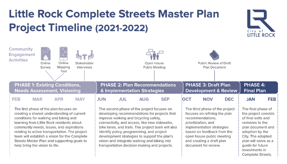 El proyecto comenzó en febrero de 2021 y continuará hasta febrero de 2022. El cronograma del proyecto de 13 meses se divide en cuatro fases, comenzando con un análisis de las condiciones y necesidades existentes y el desarrollo de una declaración de visión para formar la base de los objetivos del plan y recomendaciones (Fig. 1). El proyecto continúa durante el verano con el desarrollo de una futura red de calles completas, senderos, aceras y ciclovías para apoyar el transporte activo. El equipo del proyectotambién explorará programas, políticas y estrategias de implementación para expandir las opciones de viaje para los residentes de Little Rock y hacer que caminar y andar en bicicleta sea una parte integral del sistema de transporte más grande. En el otoño, el equipo del proyecto desarrollará un borrador de documento de plan que sintetiza todo el trabajo realizado hasta la fecha. Luego de una revisión por varios departamentos de la Ciudad y por el público, el equipo del proyecto finalizará el documento del plan en enero y febrero para su revisión final y adopción formal como un documento de política de orientación para el personal de la Ciudad y los funcionarios electos.