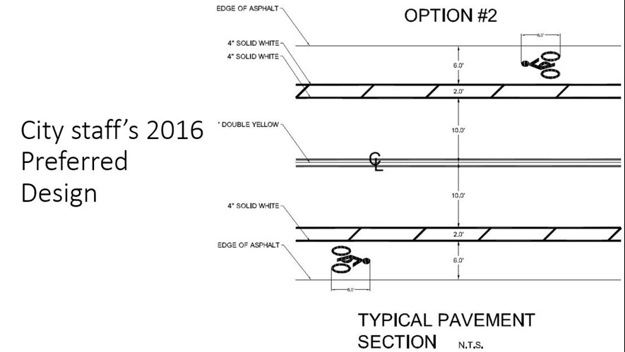 Figure 3. City staff’s 2016 design removed parallel parking from both sides to give the bike lanes greater width and a buffer.