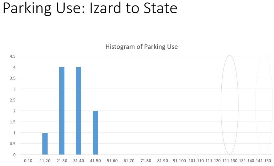 Figure 5. Histogram of parking demand for 7th Street: Izard to State and one block away. This includes side streets (Izard: 7th to 8th, Izard: 7th to 6th, State: 7th to 8th, and State: 7th to 6th) plus public parking at NE corner of Chester and 7th. Demand (current use) in blue lines. Parking capacity after parallel parking removed from both sides of street (8+12=20 spots removed on 7th Street, Fig. 4) is 124 cars (circle).