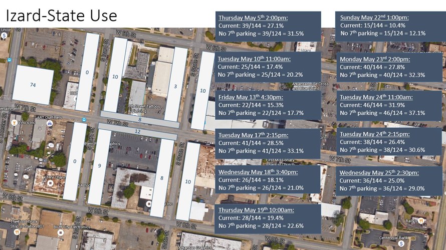 7th Street was the focus of Little Rock’s 2nd Pop Up in the Rock event in 2013 (Fig. 1). The revitalization efforts proposed by Pop Up in the Rock featured bike lanes (Fig. 2). They proposed to create 4.5 ft. wide conventional bike lanes and retain parallel parking on one side of the street. In 2016, the City of Little Rock resurfaced 7th Street from Broadway to Chester. We considered adding bike lanes at that time, but instead remove parallel parking on both sides of the street and create buffers for the bike lanes (Fig. 3). We collected parking data showing that parking demand would not exceed the capacity of the side streets one block away from 7th Street (e.g. Figs. 4-5). We reached out to affected businesses, most of which were neutral or positive, and we had a public meeting. Ultimately, we decided not to add bike lanes on 7th Street at that time because the five blocks of bike lanes would have limited stand-alone utility. Instead we would wait until we had a longer corridor with which to work… like the 2022 7th Street resurfacing from Chester to Marshall.