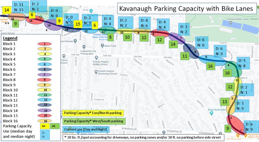 Figure 1. Parking capacity (green and yellow) on Kavanaugh between Markham and Walnut with buffered bike lanes as currently proposed.