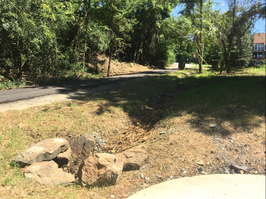 Figure 4. The new trail intersects with the existing Allsopp Trail where it exits onto Cedar Hill Dr. (view from the new Allsopp trail looking at original, recently resurfaced Allsopp trail toward Cedar Hill Dr.).
