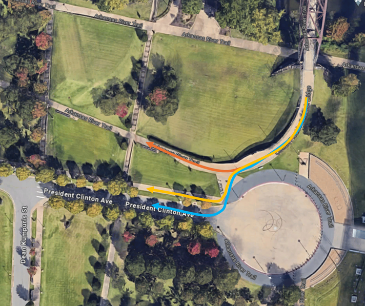 The Blue arrow puts the rider on a street typically devoid of traffic. The Yellow arrow puts the rider on an 8′-wide level concrete sidepath along Clinton Ave. The Orange arrow also puts the rider on an 8′ wide concrete path, but it requires the sharpest turn off of the bridge and continues to slope down. The Orange arrow is the official Arkansas River Trail but can put fast-moving riders in conflict with pedestrians with little width to navigate.
