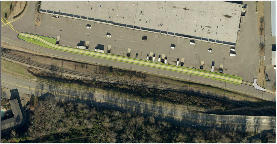 The proximity of the tracks to the street make it unsafe to create an off-street trail facility to the south of the street. The street’s width makes it impossible to create an on-street facility without making the street one-way to vehicular traffic. While not ideal, the optimal solution here is to create a sidepath on the south side of the street (Fig. 2). The slope of this greenspace would likely require a retaining wall on the east side of the greenspace.