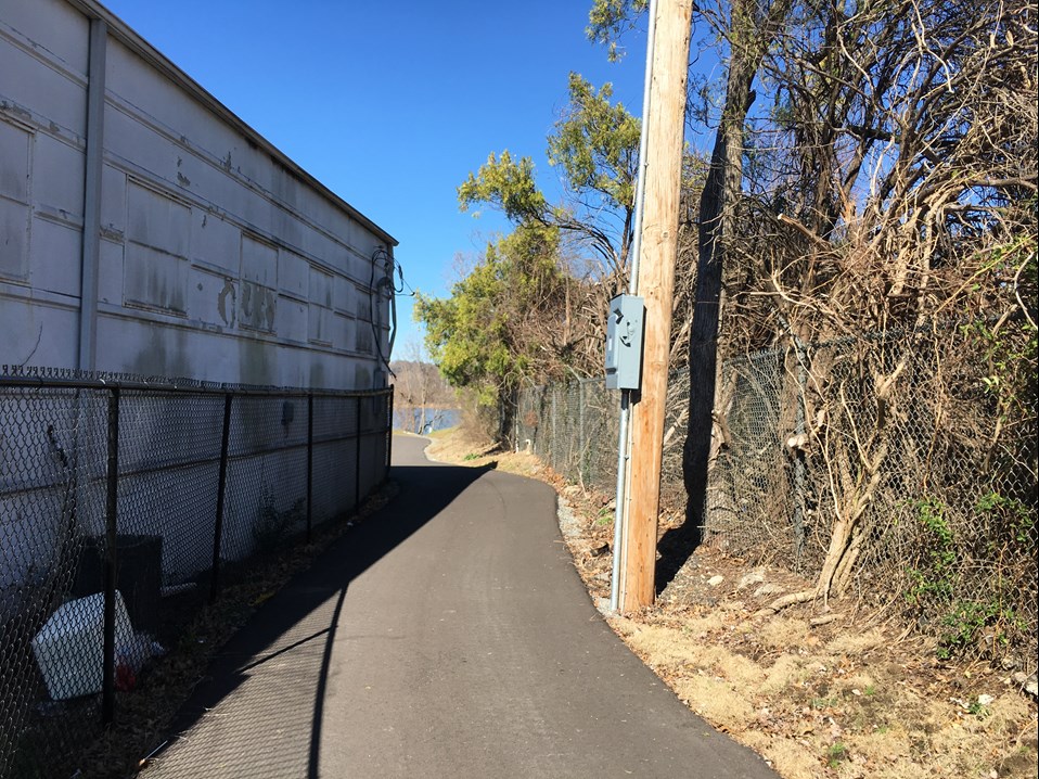 Figure 6. The temporary trail from Picture 5 to the Cantrell sidewalk winds between a building and the Dillard’s fence and a utility pole. If this were to become the permanent Arkansas River Trail, the trail would have to be widened to 12 ft. wide with a three ft. level clear zone on both sides to meet minimum Arkansas River Trail standards. This would require movement or destruction of some of these obstacles.