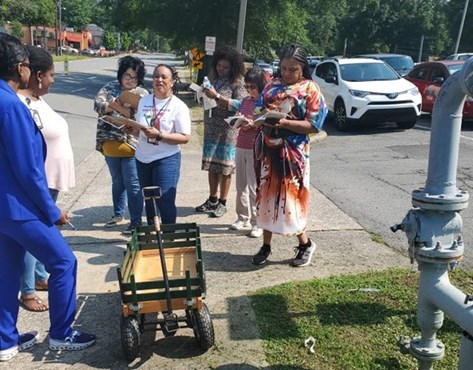 Figure 3. Shanetta Agnew leads walk audit with, from left-right, Jo Thompson, Amanda Hunter, Rachel Johnson, Sheila Couch, Sheryl Alexander, Tsai Mei, Teneice Floyd. Photo by Shanetta Agnew.