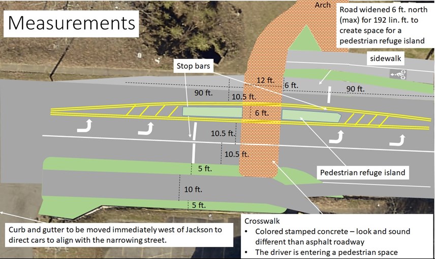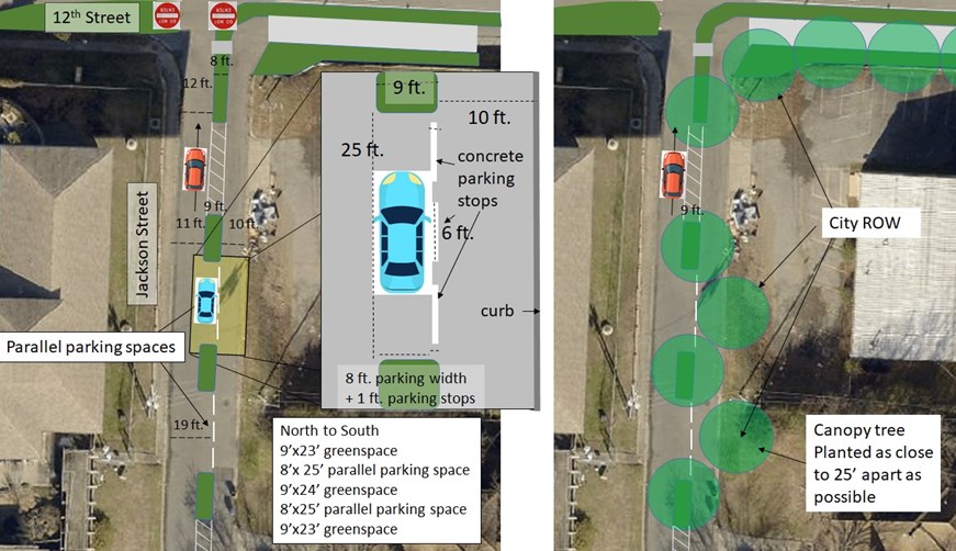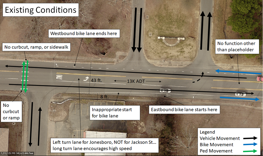 Future Phase: Jackson St. will be one-way north between 12th and 14th Street to allow the left turn lane onto Jonesboro to continue west past Jackson St. to facilitate morning rush hour traffic stacking. This will also create space for a 10 ft. wide sidepath on the east side of Jackson St. between 12th St. and 14th St. (Fig. 20). Physical separation between the sidepath and the travel lane will be created by greenspaces and parking stops. Eight parallel parking spots will be retained on Jackson St. between 12th St.and 14th St., far exceeding current parking demand. Southbound sidepath users must stop and yield to conflicting traffic at Jackson and 14th. This was planned for Phase 3 but not funded.