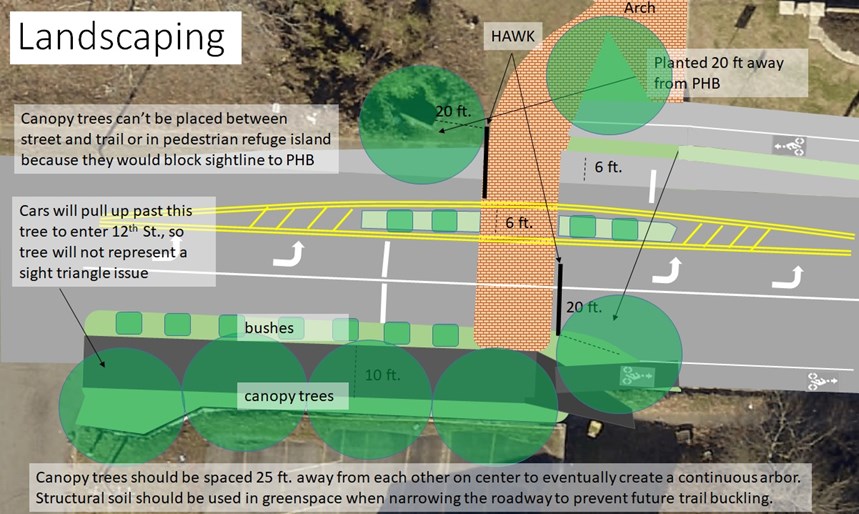 Canopy trees will be planted just north of 12th Street and along the 12th Street sidepath; these canopy trees will eventually create a closed canopy. When funding allows, additional canopy trees will be planted along Jackson St. between 12th and 14th Street. Arboring will reduce heat island effects, create shade that will make the facility more comfortable, and pull the park aesthetic across 12th St. to bridge the divide it creates between park amenities and an underserved community. Bushes will be used in landscaping where sightlines between cars and bikes are important. Landscaping will also alert 12th Street drivers that this is a shared space with people on bikes and walking(Figs. 16-17).