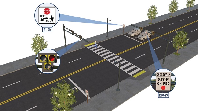 Figure 17. 12th Street crossing with landscaping in a street view. Note how the trees in back of the HAWK signals serve to frame the signals by reducing visual clutter behind them.
