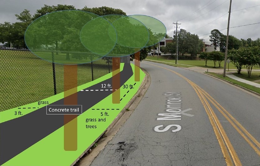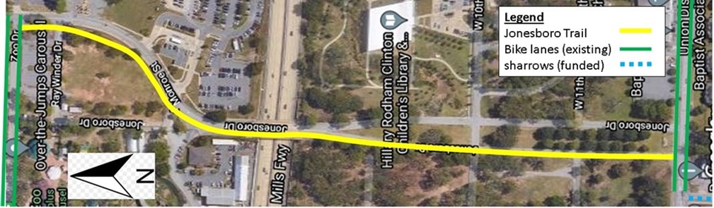 Phase One (Partially Funded 2021): The Jonesboro Children’s Trail from 12th Street to the overpass was generously funded through a Metroplan Surface Transportation Block Grant. This project was funded, but not fully funded. Not all of the placemaking features in Figure 2, e.g. the gateway and other placemaking features, but the corridor will be safe and functional.