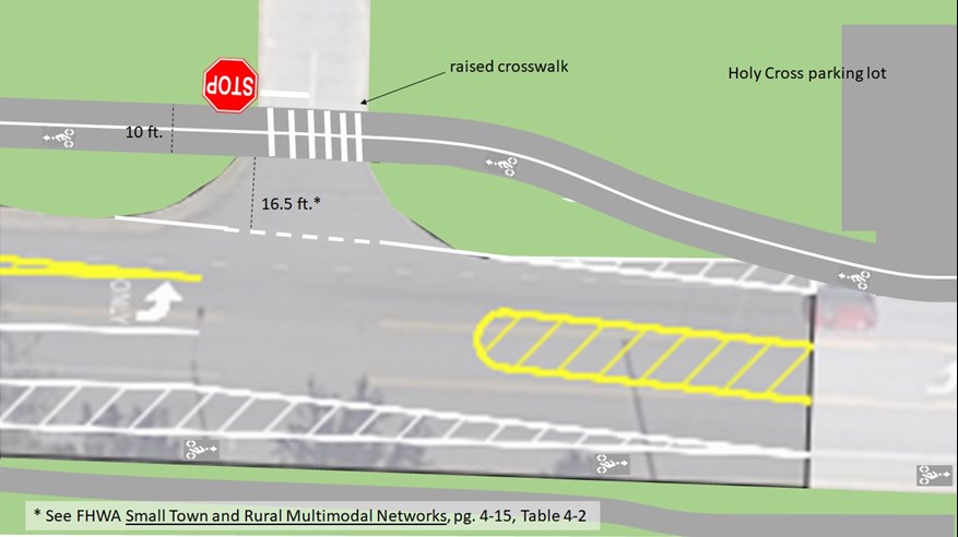 Figure 13. This is an aerial concept drawing of the 12th Street crosswalk. Note the sidepath on the south side, the space for which will be created by moving curb and gutter into the existing 43 ft. wide street corridor.
