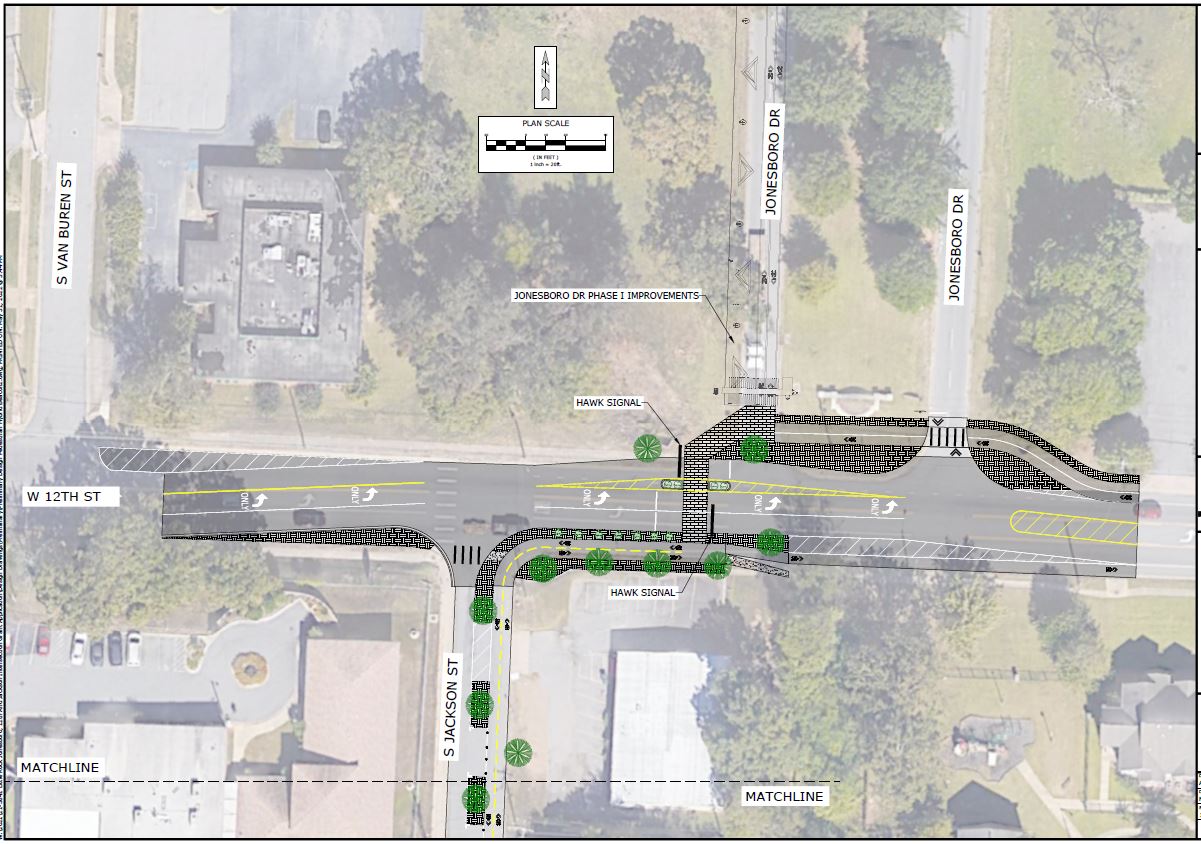 ARDOT TAP funding will allow us to move an underutilized HAWK signal just west of 12th and Madison Streets to this crossing (Fig. 12). We would incorporate several traffic calming measures to slow traffic and increase signal compliance including stamped concrete, crosswalk overhead lighting, advance stop bars, and a lateral shift in travel lanes (Fig. 13). We will change 12th Street geometry slightly north to facilitate a sidepath immediately south of 12th St. between Jackson St. and the crosswalk and allow space for a pedestrian refuge island (Fig. 13-17). A raised crosswalk across Jonesboro a car length from 12th St. will calm traffic and allow a car to cross the BikePed facility before waiting for a break in traffic at 12th Street (Figs. 14-15).