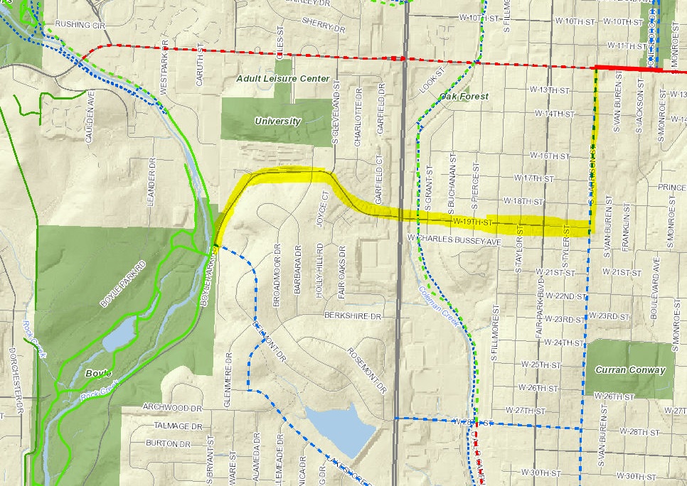 Because of street width, parking, and traffic conditions, sharrows might be the most appropriate bicycle facility in this connection.  Extending the 12th St. bike lanes from Harrison to Rock Creek may seem a more intuitive and better protected solution, especially since bike lanes are proposed in the Master Bike Plan for this section of 12th St. (Fig. 1), but the street width makes adding bike lanes impossible without reducing the number of traffic lanes and traffic counts make a road diet problematic in this area.  Crossing University is also a challenge at the very busy 12th and University intersection.