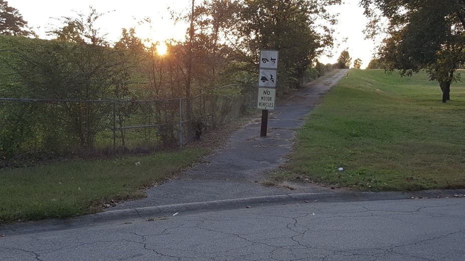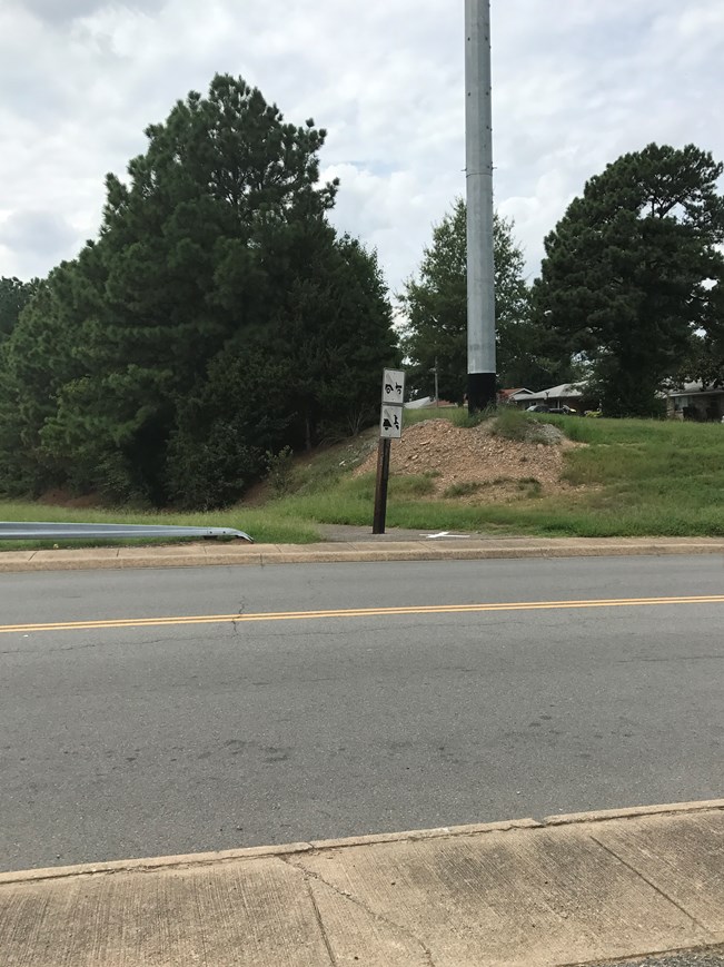 Figure 4. This is a view of the western I-630 trail access from Hughes from the eastern trail access point (see also Fig. 3). The trail west of Hughes has a crossing farther to the north to avoid the guardrail, so a trail realignment to create a straight crossing would have to be done on the trail to the east of Hughes. Approximately eight inch high curbs and a large sign post also increase the challenge of this crossing. Photo by Leland Couch.