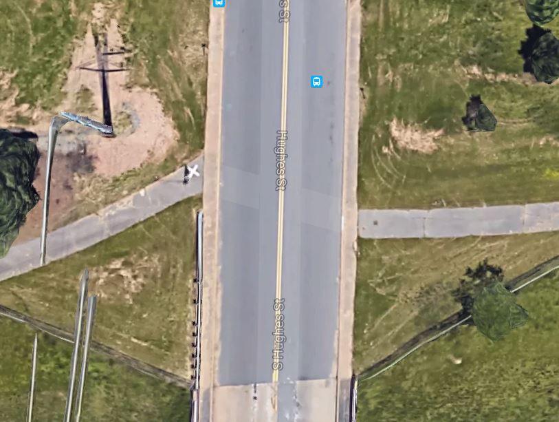 Figure 3. The spacing of the entrance and exit of the I-630 trail at Hughes doesn’t align, creating a longer and more dangerous crossing of Hughes St. than is necessary. Current bus stops here can increase the utility of Rock Region and the Midline.