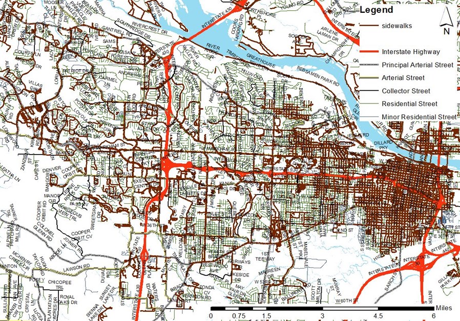 Figure 4. Most of our street system does not have sidewalks (brown line), decreasing neighborhood connectivity and cohesion and discouraging walking as a means of transportation or immediately accessible recreation/self-care.