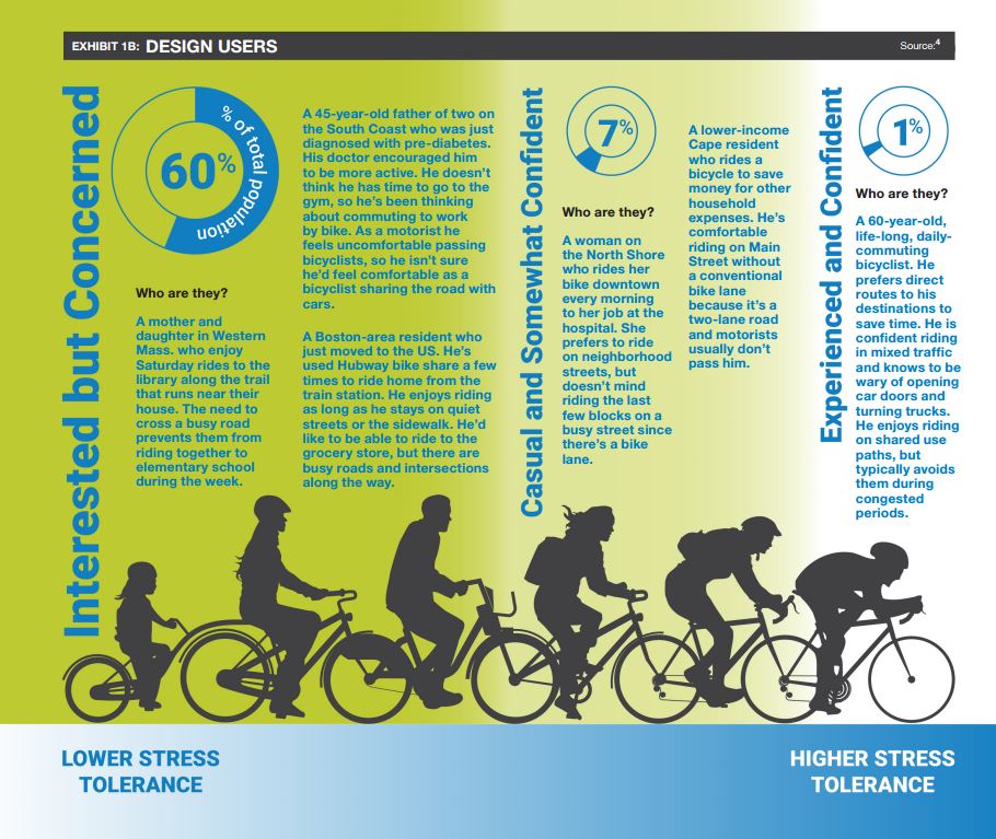 Figure 6. Research shows that improving separation from vehicles expands the types and numbers of riders that will bike commute. Figure from MassDOT’s Separated Bike Lane Planning and Design Guide and based on the research of Dill & McNeil (2012).