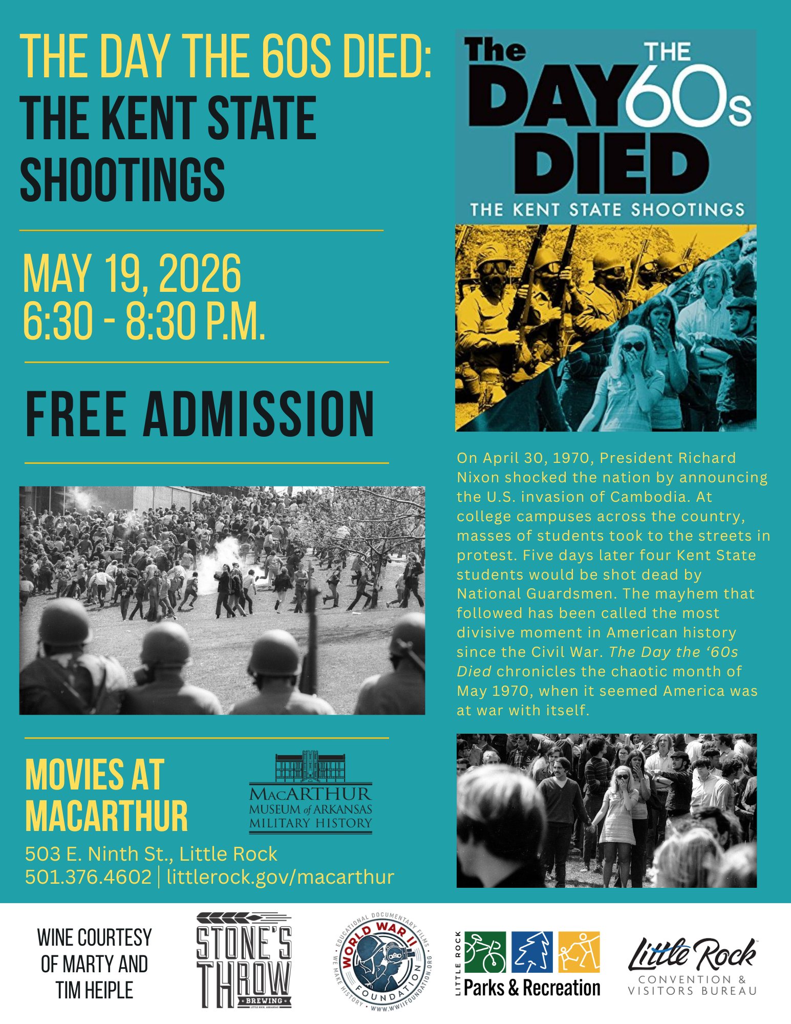 Join us Tuesday May 19, 2026 at 6:30pm for the showing of The Day the 60’s Died: The Kent State Shootings. The mayhem that followed has been called the most divisive moment in American history since the Civil War. This film documents the chaotic month of May 1970, when it seemed America was at war with itself.