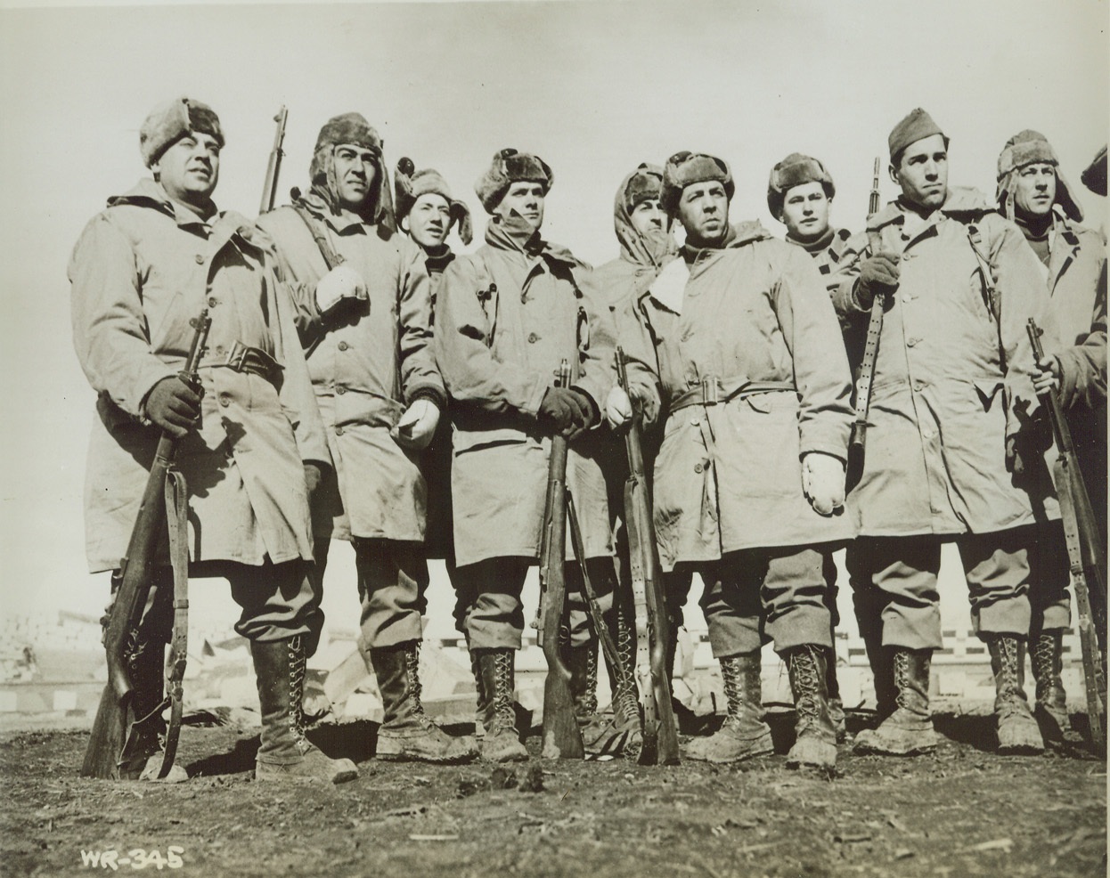 HELPING BUILD ALASKAN HIGHWAY, 4/3/1942. BRITISH COLUMBIA – American fighting men looking remarkably fit and well-fed, are shown on duty on the new U.S. to Alaska Highway. Front row, left to right: Pvt. George Francesconi, Chicago; Pfc. Joe Trevino, Corpus Christi, TX; Pvt. Joe Stack, Buffalo, N.Y.; Pvt. John Viveriot, Buffalo; Pvt. Don Silverthorn, Kenmore, N.Y. Back: Pvt. Henry Geyer, Pittsburgh; Sgt. A. F. Gill, Warrior Run, PA; Pfc. John Sadler, Valley Mills, Tex.; Pvt. W.R. Mullins, Detroit, Tex. Credit: OWI Radiophoto from ACME;