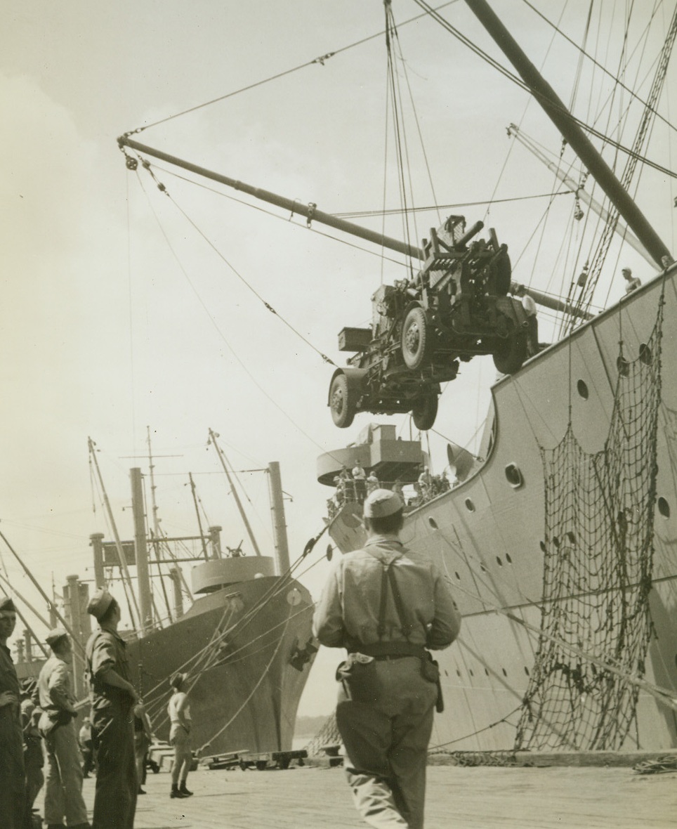 “Ack-Acks” from America, 4/8/1942. Australia – A three-inch anti-aircraft gun is unloaded from a U.S. transport which arrived in an Australian port with troops and supplies from America. Passed by censors. Credit: ACME;