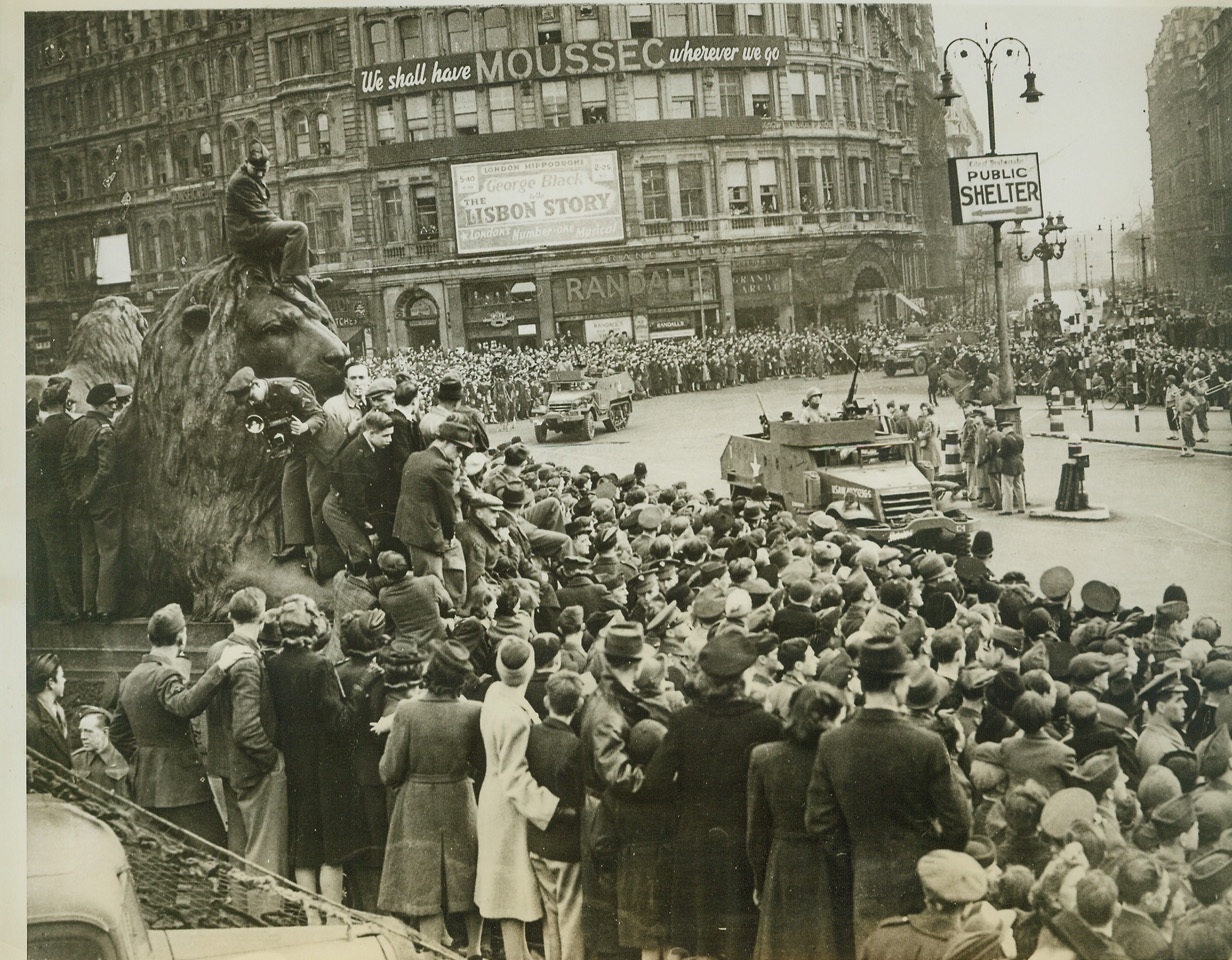 U.S. Troops in “Salute the Soldier” Parade, 4/7/1944. LONDON — U.S. troops pass through Trafalger Square on the way to the Mall in support of the “Salute the Soldier” ware savings drive. They are the first foreign troops to march through London in full battle kit. Credit: (ACME);