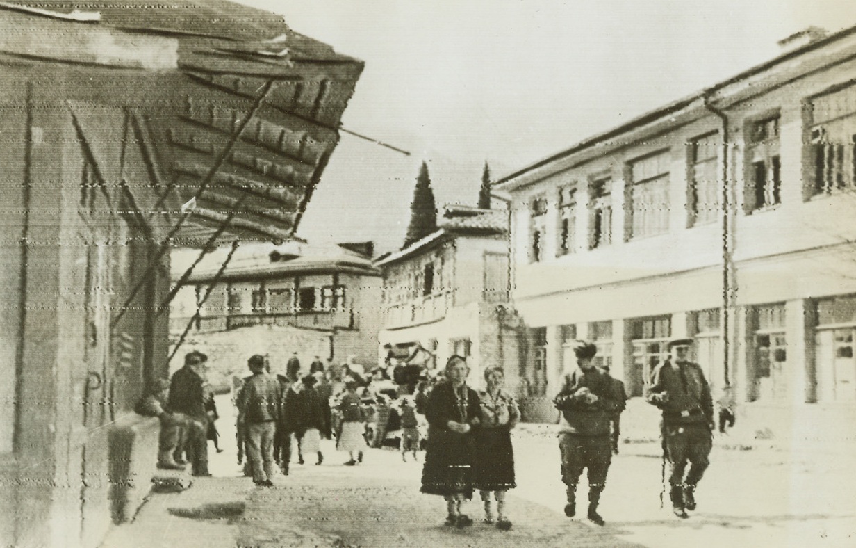 Russia Lives Anew, 4/26/1944. Gurzuf, Russia—In the warm spring sunlight, residents of Gurzuf walk down the town’s main streets where the buildings have been rebuilt by Russians returning to the Crimean town after Red forces had freed it of Nazi occupation. Though the war has meant a dark spot in their lives, Russians quickly return to normal living when the battle has passed them. (Passed by censors). Credit: ACME radiophoto.;