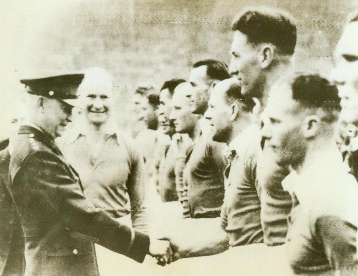 Ike” Calls Time-Out, 4/15/1944. Wembley, England—Gen. Dwight D. Eisenhower shakes hands with members of the Charlton team, winners in the Southern Cup Football final against Chelsea at Wembley Stadium. Gen. Eisenhower came as an unexpected guest to witness his first soccer game and the record wartime crowd of 85,000 gave him a thunderous ovation 4/15/44 (ACME Radiophoto);