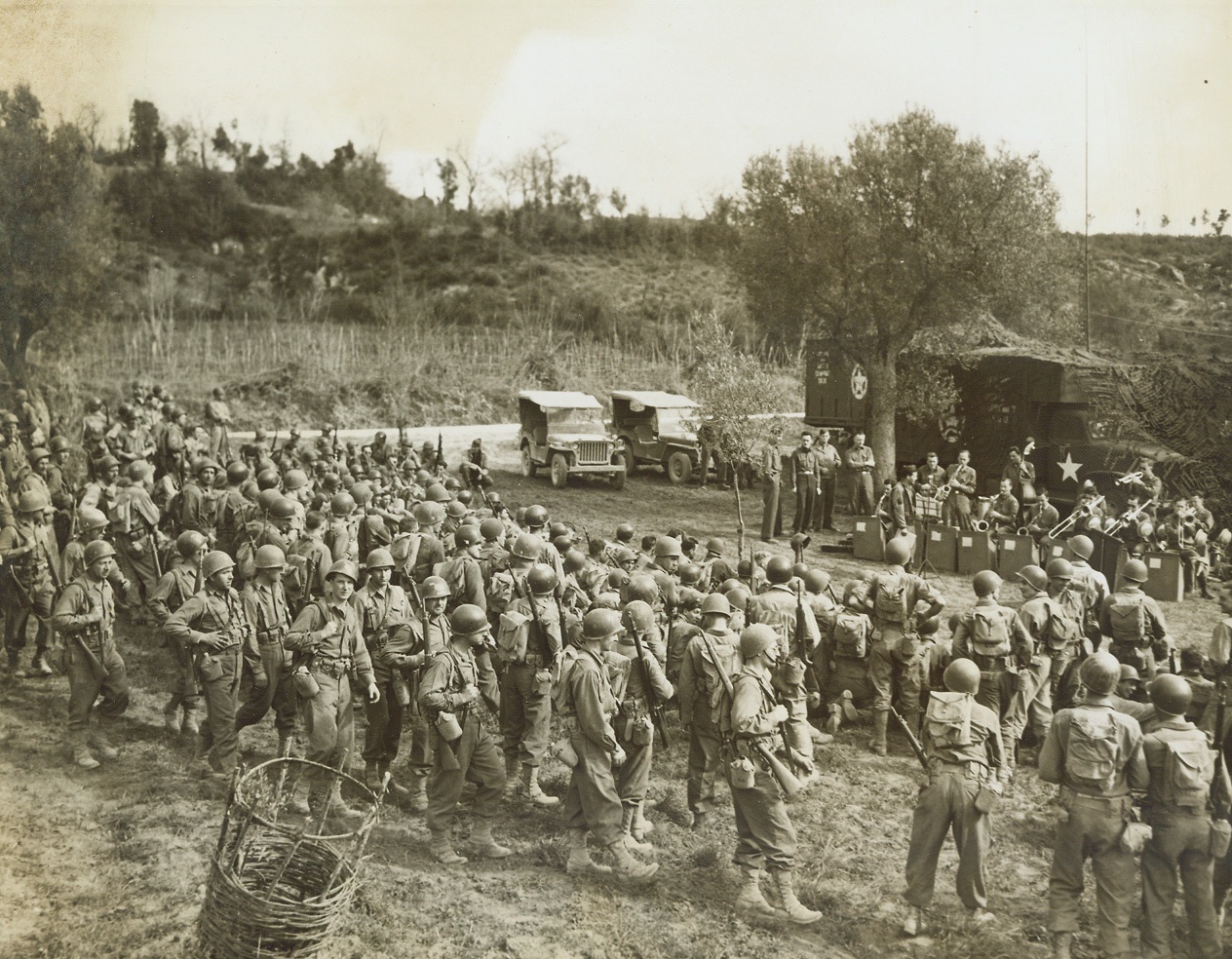 MOBILE RADIO STATION “GETS AROUND”, 4/19/1944. ITALY—War weary men and women of the Allied Fifth Army in Italy are mighty proud of their mobile radio station, officially known as the Fifth Army Mobile American Expeditionary Station, which gets it [sic] music and its “big time” programs to them wherever they are—in the front lines, or in rest camps. The hard working crew that moves the station’s ten-unit “circus caravan” of jeeps and trailers, and 2-1/2 ton trucks to various points in the combat area making sure that every group is reached at least once a day, have the moving operation down to a fine point. They can take the station down, move it 50 miles (which is the range of the transmitter), and set it up again, all within less than two hours. Here, a Fifth Army band set up before the station “somewhere in Italy,” furnishes a swing concert for Combat Engineers of the 337th Battalion, who call a halt to listen. At the same time, the music is broadcast by the station.Credit: Acme photo by Sherman Montrose for the War Picture Pool;