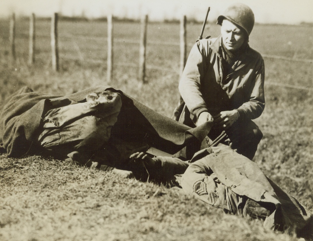 SORROWFUL FAREWELL, 4/21/1944. ON THE FIFTH ARMY BEACHHEAD—A mixture of sorrow and anger appears on Pfc. Earl H. Brandell’s face as the covers the bodies of two of his fighting friends who were killed by Nazi machine gun fire. The soldiers were killed during attack by Allied 5th Army infantrymen on enemy positions in the Anzio beachhead area in Italy. Brandell is from Fort Atkinson, Wis.Credit: US Army photo from Acme;
