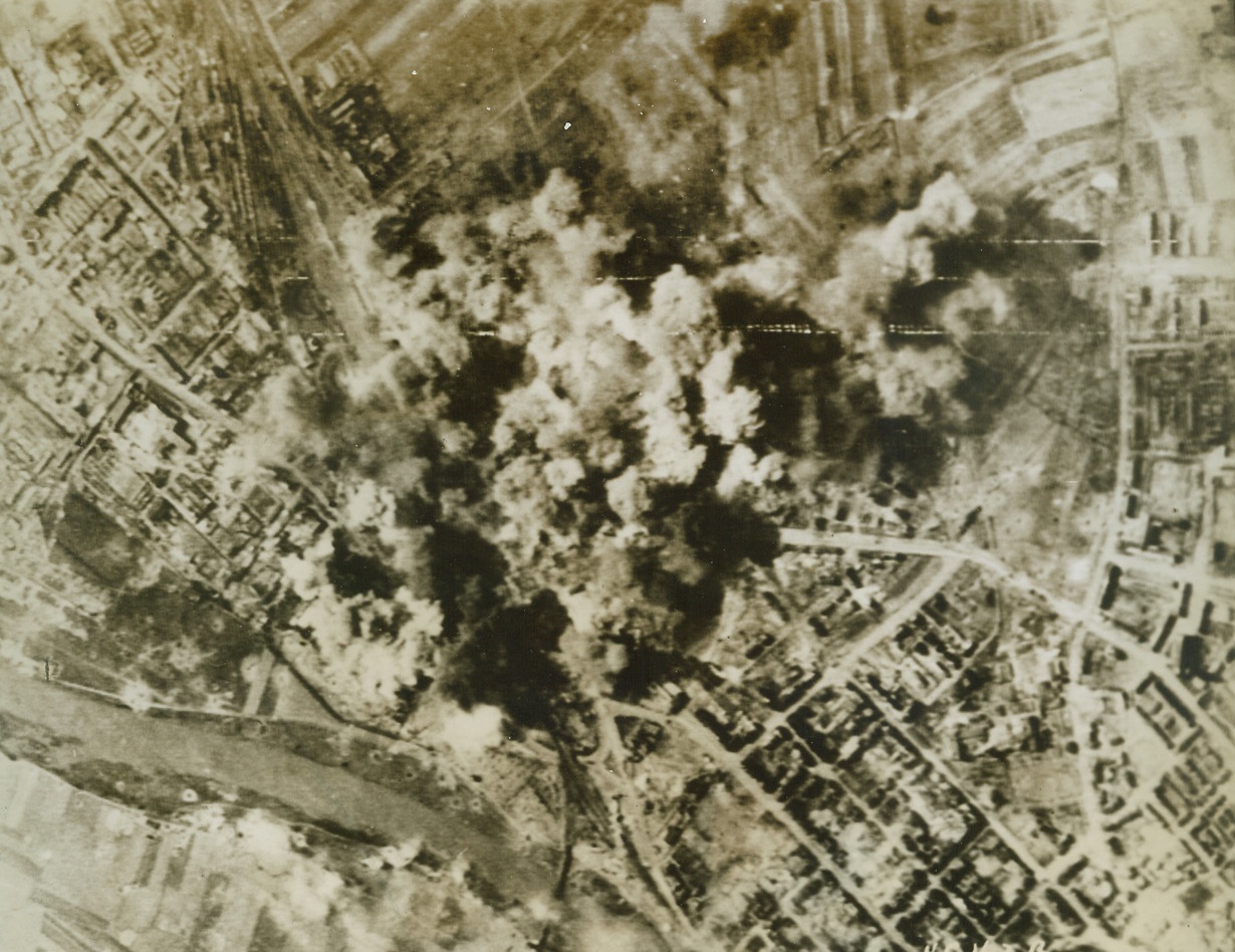 One-Two Bombing Technique, 4/16/1944. GERMANY — Using a boxer’s system of hitting his opponent with successive blows so that he does not have a change to recover from the first blow, the Eighth Air Force returned to Schweinfurt on April 13th to stop rebuilding efforts on ball bearing plants there after the February raids. The Flying Forts met heavy enemy opposition. Credit (Signal Corps Radiotelephoto from ACME);