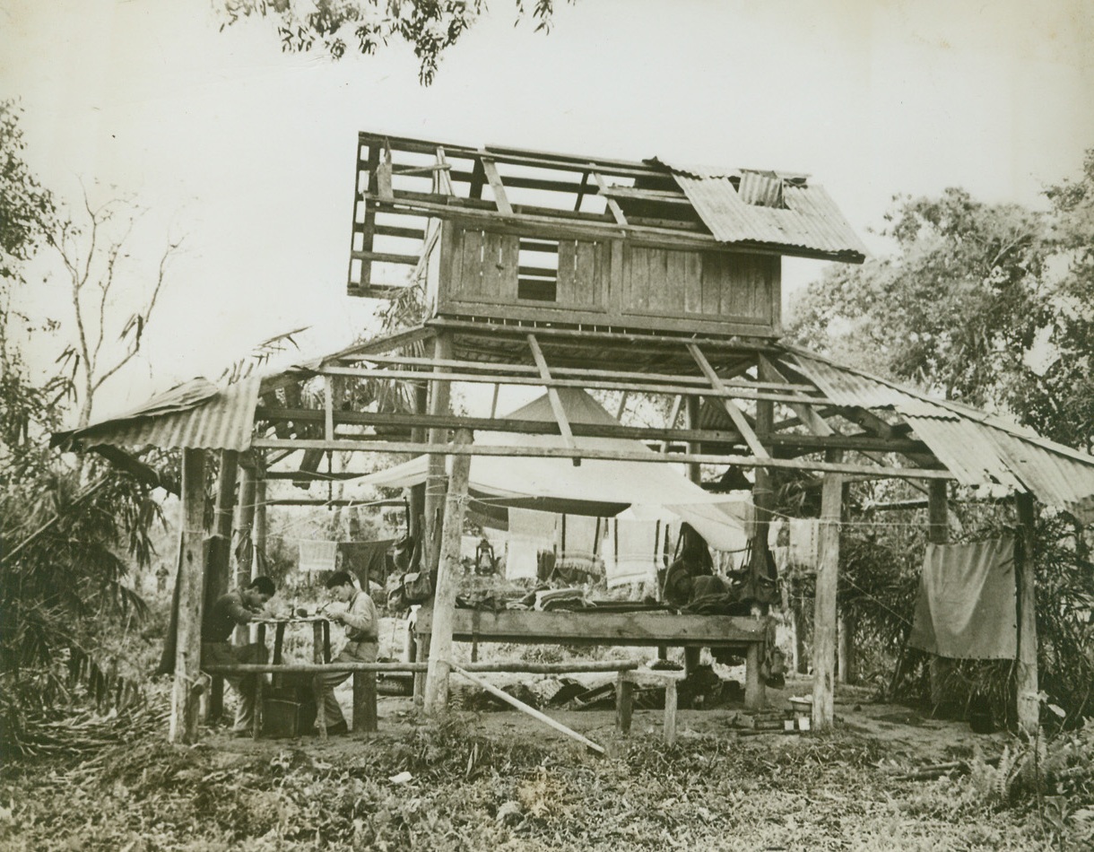 ALL THE COMFORTS—, 4/7/1944. MAINGKWAN, BURMA—Chinese officers, members of the valiant Allied force fighting under General Stilwell in Burma, set up housekeeping in the ruins of a temple at Maingkwan. Two men work at an impromptu desk at left, while a third fixes the “bed” in center. Bedclothes and wash hang from lines strung between the supports of the shattered building. Credit: Acme;