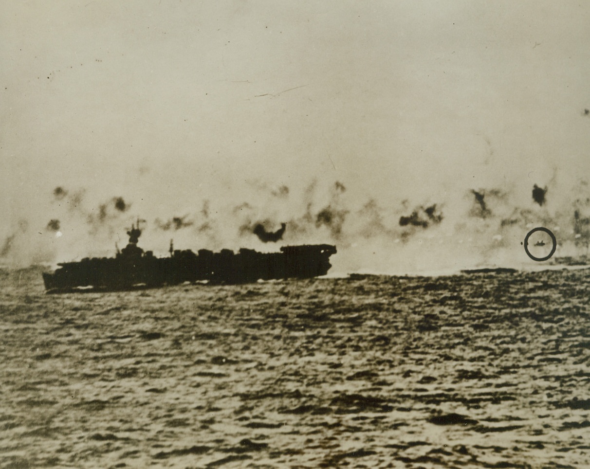 Death Claims Another Jap, 4/5/1944. Seconds after this photo was taken, the Jap “Betty” bomber marked by the circle (right), slammed into a deadly wall or anti-aircraft fire from the U.S. Navy carrier, left), and crashed into the sea. The Nip plane was one of those trying futilely to ward off the attack of a U.S. Navy task force of Saipan, in the Marianas last Feb 22nd. Credit line (U.S. Navy official photo from ACME);