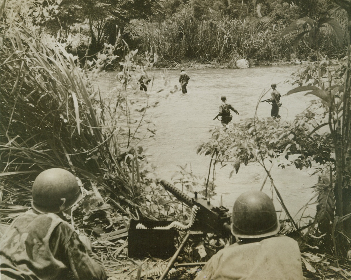 Advancing Under Cover, 4/9/1944. New Guinea – Cautiously advancing under the cover of a .50 caliber machine gun (foreground) American infantrymen wade across a river running through thick New Guinea jungle. The heavy foliage rising immediately on the opposite side of the river could provide excellent hiding places for Jap snipers. Credit line (Signal Corps photo from ACME);