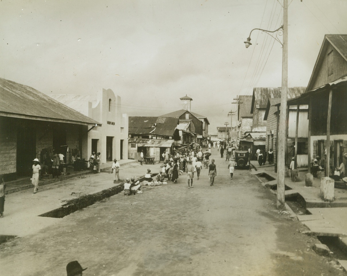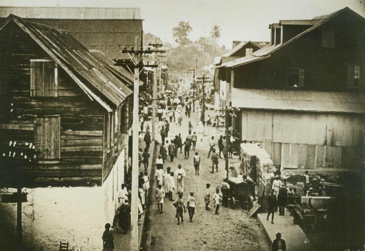 Liberian Street Scene, 8/27/1942. Monrovia, Liberia—American cultivation of rubber began on a large scale in Liberia, on the west coast of Africa, when the Firestone organization began its planting on two 50,000 acre plantations. Since then, American institutions—chain stores, electric lights, autos, movies, radio, and paved streets—have become familiar sights in this 100-year-old Negro Republic. Here is a typical street scene in the native quarter of Monrovia, the capital of Liberia, which was named after President Monroe. Editors: these photos of scenes in Liberia are sent to you for use with future wire stories. Please file them for reference. Credit: ACME.;