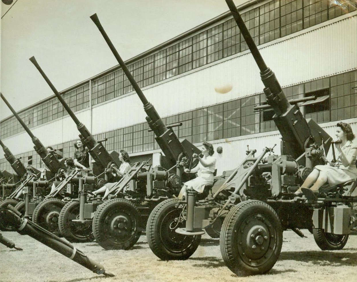 Big Bofors Anti-Aircraft Guns Ready To Smash Axis, 8/28/1942. Akron, Ohio — Thirty and more a day of the big Bofors anti-aircraft guns roll off the assembly lines of Firestone Tire and Rubber Co., here as all-out production begins to really roll these guns in the direction of all fronts. Above photo shows a day’s output lined up outside the plant. Guns were originally Swedish design. (ACME);