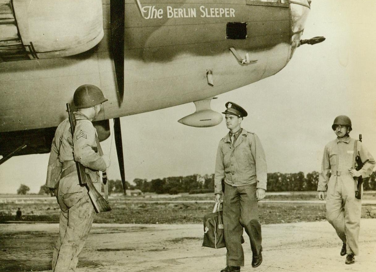 Ready To Deliver Sleeping Powder To Nazis, 8/5/1942. Somewhere in the British Isles – In many parts of the British Isles, U.S. Air Force flying fortresses are waiting for the “zero hour,” waiting to deliver “block-buster” bombs to Berlin – And anywhere else the Nazis may be gathered. Here, Lt. Edward B. Weathers, of Ocala, Fla., walks up to his bomber, which is appropriately named, “The Berlin Sleeper.” He is accompanied by soldiers carrying sub-machine guns, for he carries the valuable and secret American bombsight. 8/5/42 (ACME);