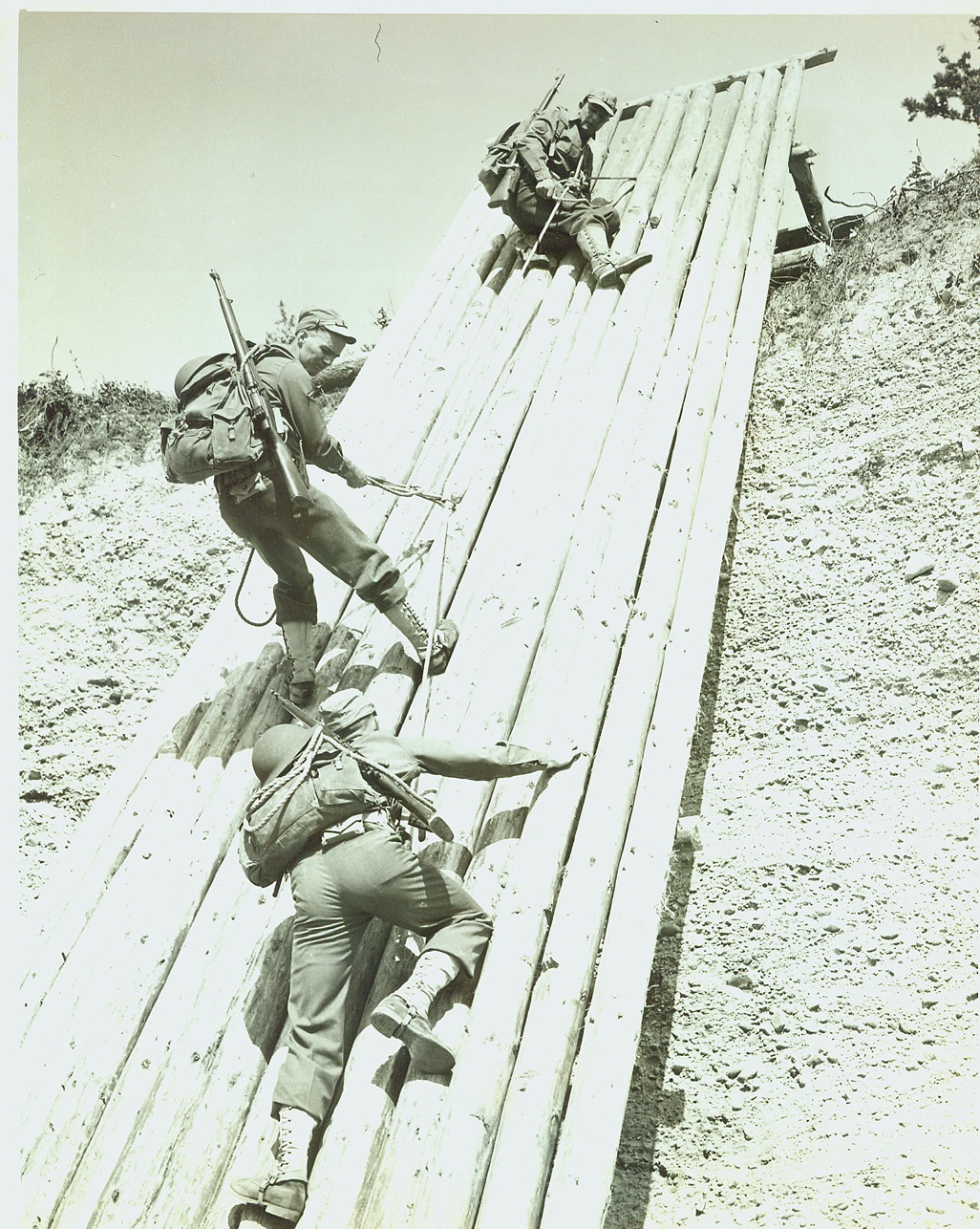 Ski Troops in Winter-Mountaineers in Summer, 8/16/1942. PACIFIC NORTHWEST – A new branch has been added to Uncle Sam’s Army – a full-fledged “Mountain Regiment”, with 1,400 men who are undergoing a rigid and specialized training program. Last winter these same men formed the first organized ski troop battalion in the U.S., but now that the ice and snow has given way to summer heat and dust they are being developed into a regiment intended as a nucleus for similar units of mountain infantry. The regiment’s commanding officer, Col. O.S. Rolph, inaugurated the ski patrol and today personally supervises every phase of the thorough training of the “Mountaineer Infantry”. These photos, taken at the Mountaineering Training Area, show some phases of the training. New York Bureau Carrying slung Garand rifles and a full pack, the men ascend the wooden ramp in teams of three tied together with safety ropes. Notches cut in the logs offer toe and finger holds. Credit: (ACME);