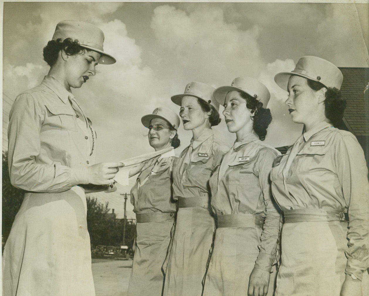 WAAC HAS SERGEANTS TOO, 8/30/1942. FT. DES MOINES, IA. —Sgt. Wilma Stanton, Los Angeles, CA., first WAAC auxiliary (private) to be promoted to grade of Sergeant reads orders to members of her squad. Left to right: Helen Delvoski, Philadelphia, PA, Opal Aliff, Huntington, W. VA, Winifred Cioffi, Rutand, VT., Helen Hickman, Atlanta, GA. Credit: OWI Radiophoto from ACME;