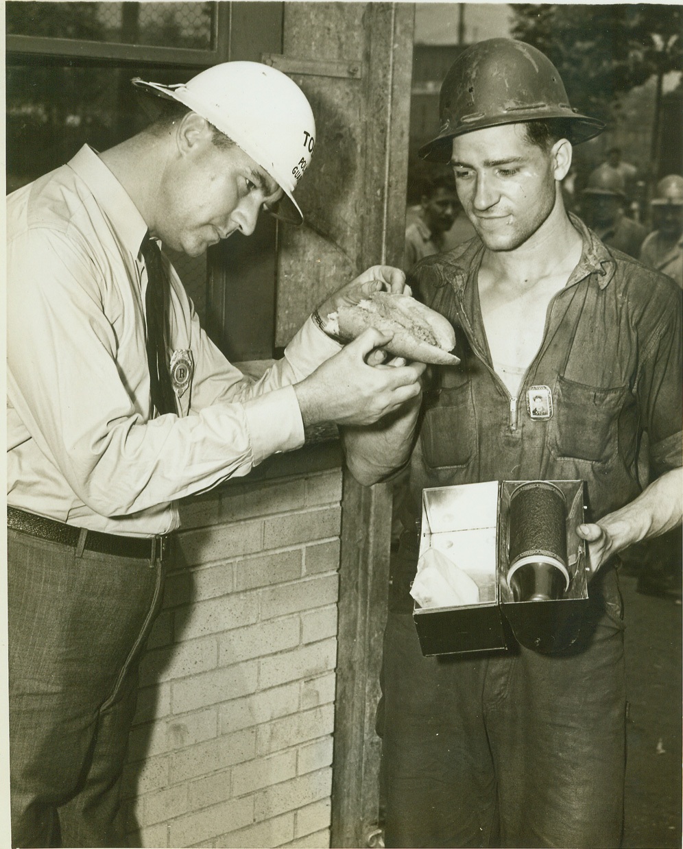 SABOTEURS KEEP OUT!, 8/4/1942. NEW YORK, NY – After four Nazi saboteurs landed on the shores of Long Island, and four on a Florida beach, recently, with detailed plans for the destruction of various installations of tremendous value to the American war effort, it became very apparent that the Axis wasn’t – and isn’t fooling. For that reason, war plants, shipyards, and other important installations are now taking precautions. An Axis saboteur would have a tough time of it trying to get into the Todd Erie Basin Drydocks, a Brooklyn unit of the Todd Shipyards Corp., for here is one of the plants that realizes the full danger the yard installations and personnel would be in, should they allow one chance to saboteurs. Therefore, they are taking no chances, as this series of photos passed by Navy censors shows. Guard Philip Mayer ,(left), even looks into a sandwich, looking for sabotage materials. Meanwhile, Jimmy Orefice, a machinist’s helper, watches anxiously, lest the guard drop his lunch. Credit: OWI Radiophoto from ACME;