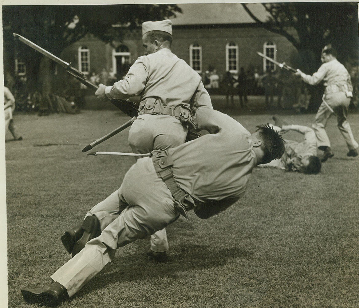 64 Recruits Graduate at Fort Slocum, 8/5/1942. FORT SLOCUM, N.Y. – In the first recruit graduation exercises in the history of Fort Slocum, 64 soldiers today became members of the permanent party stationed here, after passing through an eight weeks training period. All received diplomas and four were awarded medals for outstanding work. The ceremonies, which included a program of demonstration of the work the men received during training, was under the direction of the Post Commander Col. Bernard Lentz. The commencement address was delivered by Mayor Stanley W. Church of New Rochelle, N.Y. Here, using Commando-like tactics, one soldier is disarming another, (falling to ground, in photo), during the demonstration. Credit: (ACME);