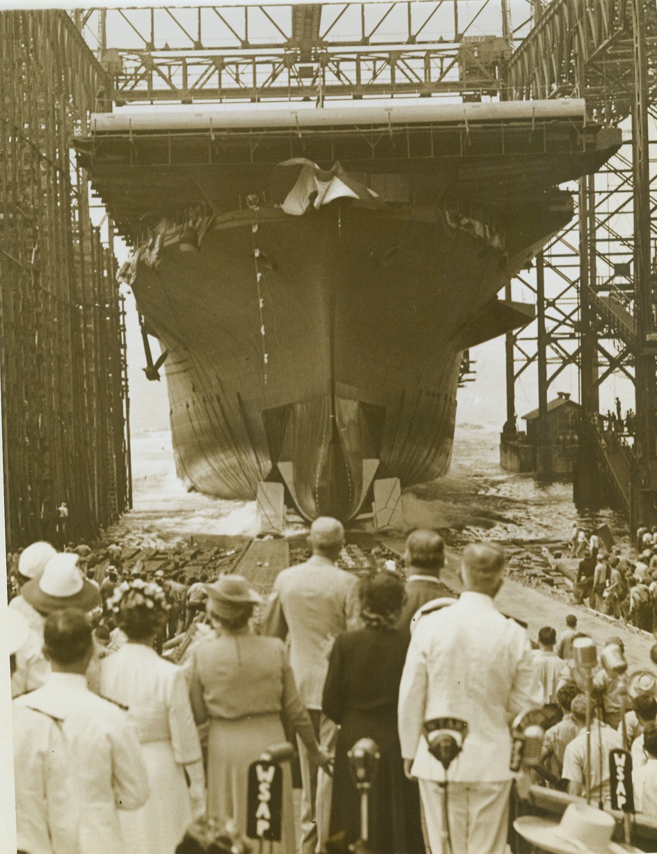 NEW CARRIER HORNET LAUNCHED, 8/31/1943.NEWPORT NEWS, VA.- The new 25,000 ton flattop Hornet slides down the ways at Newport News, christened by Mrs. Frank Knox, wife of the U.S. Secretary of the Navy. Knox paid tribute to Doolittle’s men who last year took off from the former Hornet to raid Tokyo, and said Japan could expect bigger and better raids in the future. Credit: OWI Radiophoto from ACME;