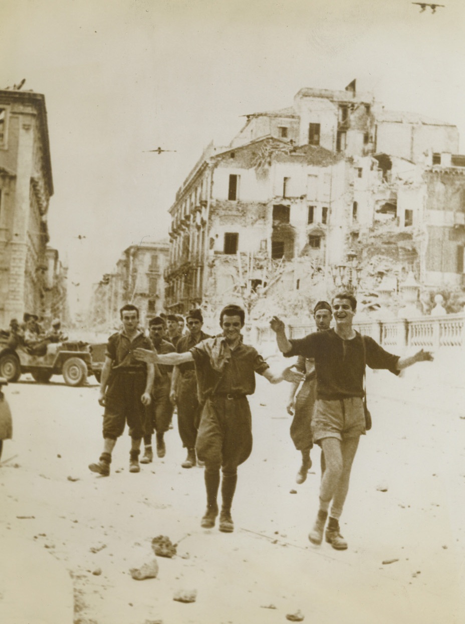 THE WAR IS OVER FOR THEM, 8/14/1943. SICILY—A U.S. soldier leads a group of captive Italian soldiers through the debris that clutters the streets of bomb-scarred Troina after our troops pushed the Axis out of the town. They are on their way to a temporary internment camp. Note the two pictures still hanging on the wall in the background. They are all that remain as evidence that the building was once a home. Credit: Acme;