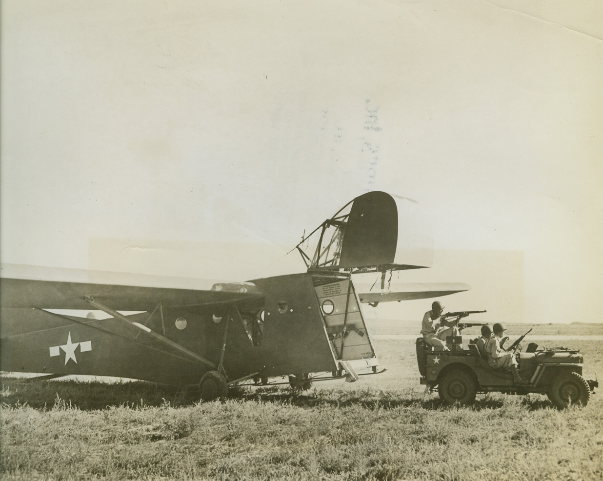 War Show Dedicates New Army Base, 8/23/1943. Alliance, Nebraska — Air-borne Jeeps and Howitzers, men and machines of war, filled the air over the army air base at Alliance, Nebraska, as nearly 60,000 persons gathered to watch the war games and display of military might which marked the formal opening of the new field under command of Lt. Col. D. Arthur Walker. The base is operated by the 1st Troop Carrier Command of Stout Field, Indianapolis, Indiana, with troop carrier units, parachute infantry, glide infantry and air-borne engineers located there. This photo shows a glider-borne Jeep ready for the “invasion.” Credit: ACME;