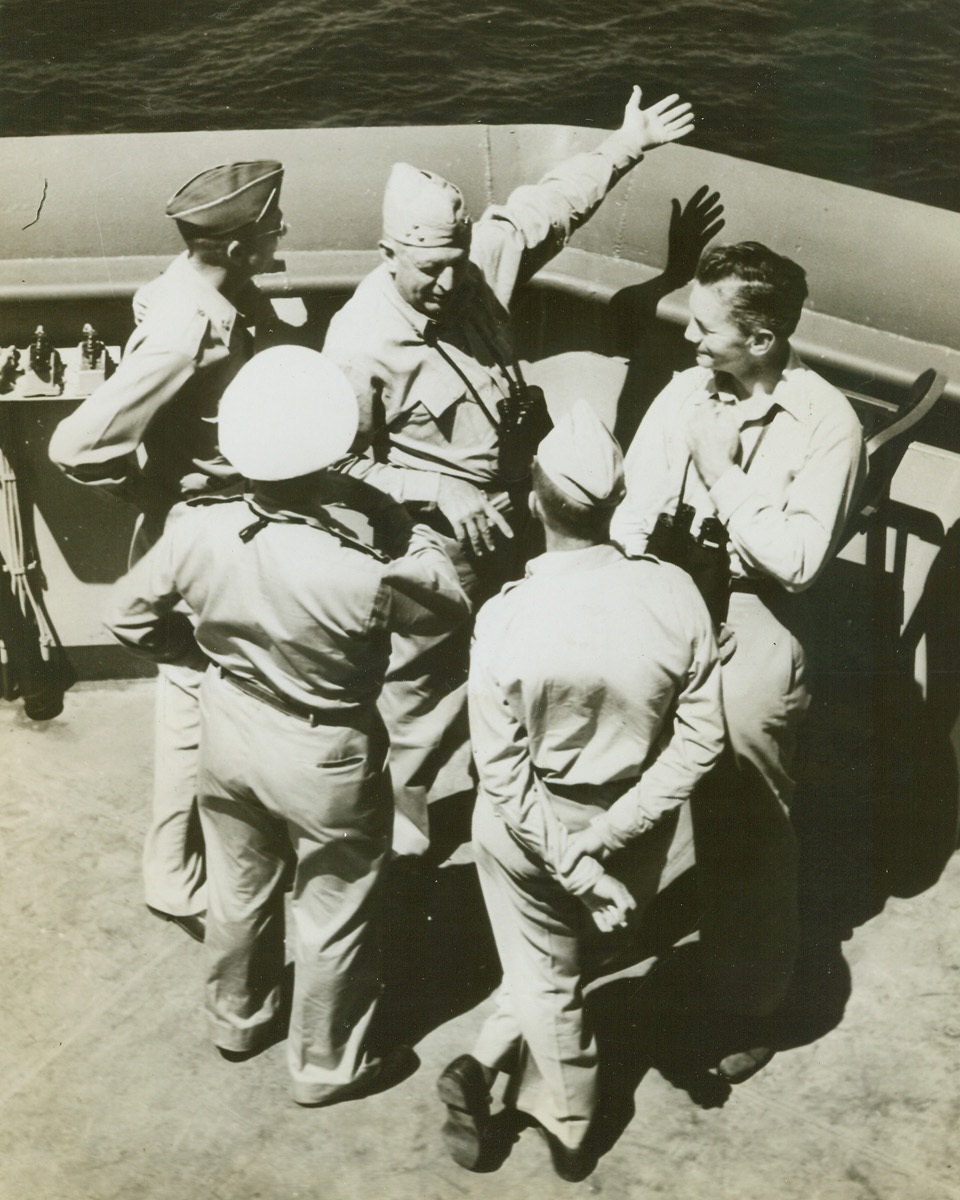 Rehashing Victory, 8/23/1944. At Sea – Relieved grins light the faces of air group 16 pilots as they discuss a victorious clash with Jap planes, after their return to their carrier. Seated (top) are; (left to right) Comdr. P.D. Buie of Nashville, GA; and Ensign W.J. Seyfferle, Cincinnati, O. Lower left: Ensign Edward G. Wendorf, West (co), Texas. With back toward camera: Comdr. L.B. Southerland, USN. Extreme right: Lt. (jg) Frances M. Fleming, Portland, Ore. Credit line (official U.S. Navy photo from ACME);